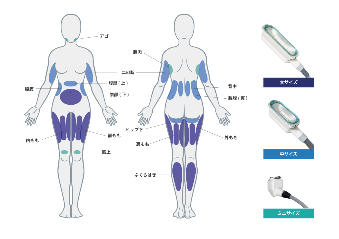 当機器THE COOL FOUR クールフォーは、大・中・ミニサイズのパドルで、体のライン・脂肪量に合わせ適切なカップを装着します。